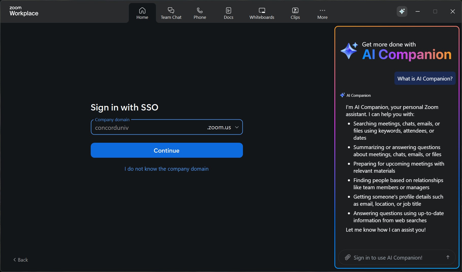 You will be prompted to enter the company domain, which is concorduniv.zoom.us.