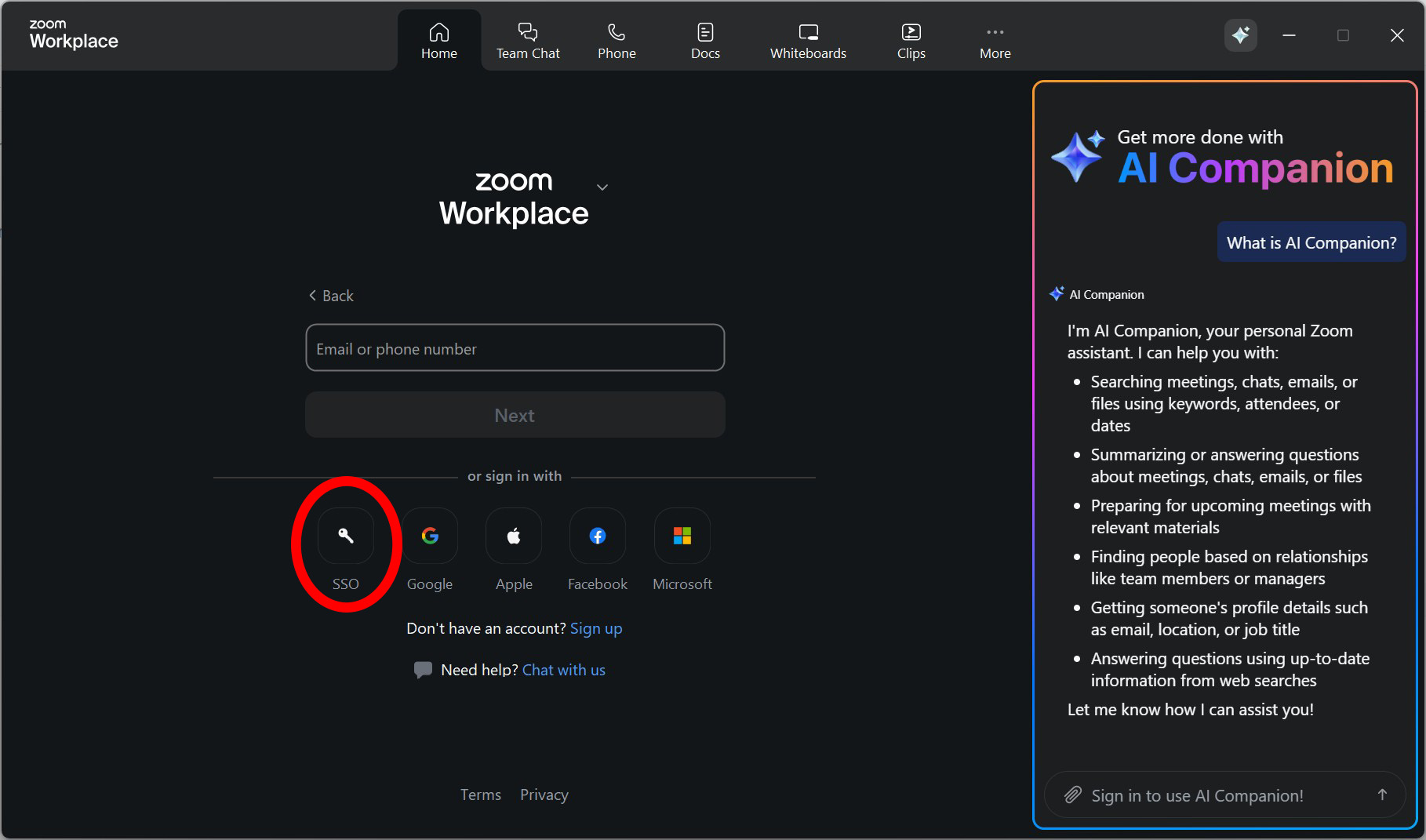 At the login screen, select SSO.